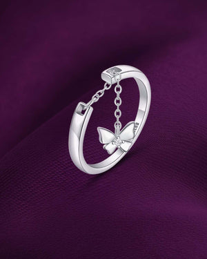 The Delicate Butterfly Silver Ring features an elegant open design highlighted by a graceful dangling butterfly charm. Subtle zircon stones add a soft, refined sparkle, creating a feminine piece that feels light, elegant, and perfect for both everyday wear and special occasions.